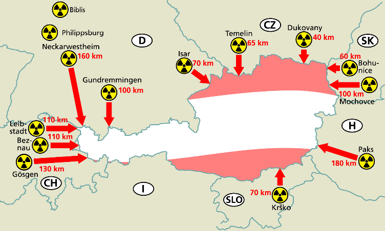 Österreich ist umzingelt von Atomkraftwerke, was immer ein Gefahr birgt (siehe Grafik unten)